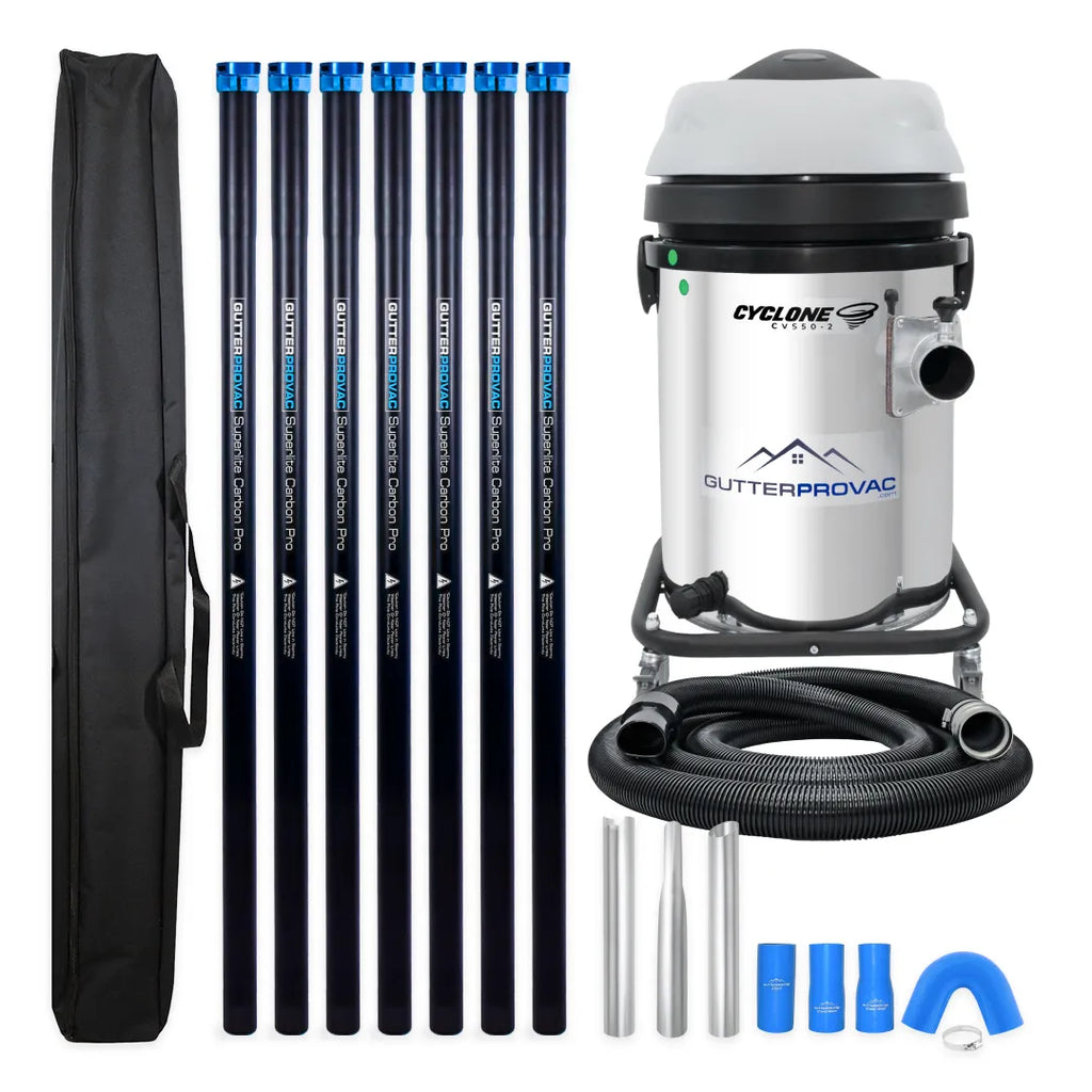 The Cyclone 2200W Stainless Steel 13 Gallon Domestic 120v Gutter Vacuum with 28 Foot Carbon Clamping Poles, and Bag Kit is tailored for homeowners seeking a safe, long term solution to their gutter maintenance needs. At the center of this kit is the 13 Gallon Domestic Cyclone Gutter Vacuum, with 2200 watts of power from two double stage motors. Its 120V domestic plug compatibility, coupled with a 50 / 60Hz frequency range, ensures versatile operation. Noteworthy is its by-pass cooling system, maintaining optimal performance with a waterlift of 88.65 inches and an airflow rate of 200.22 cfm. The vacuum's 13-gallon tankis made of durable 22-gauge stainless steel and can be easily moved around as you work with its smooth rotating back and locking front casters, supported by a sturdy steel frame. The included polypropylene hose and 28-foot power cord provide extensive reach, while the built-in drain plug and metal debris deflector provide convenience and durability. This machine also features a reusable cloth filter that fits inside the tank and is suitable for both wet and dry conditions. This means you'll have no more worrying about replacement filters.