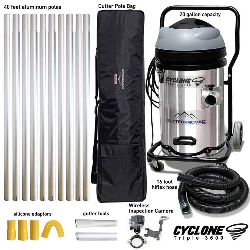 This Cyclone Triple 3600 Gutter Vacuum is a great tool for cleaning your gutters. It has three motors that provide 3600 watts of suction power, making it capable of quickly and thoroughly cleaning your gutters. The 40-foot-long aluminum gutter poles make it easy to reach even the highest gutters, and the pole bag makes it easy to transport and store the poles when not in use. The 4K Gutter Inspection Camera allows you to inspect your gutters for damage or clogs, so you can address any problems before they become worse.